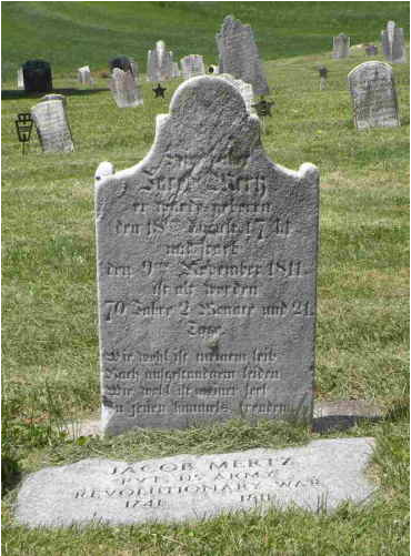 Ill. 3c Tombstone of Johann Jacob Mertz ← Previous Next → Ill. 3b Christina Mertz’s tombstone with acid rain damage and Johann Jacob Mertz’s replaced tombstone 3a Tombstone of Johann Jacob Mertz