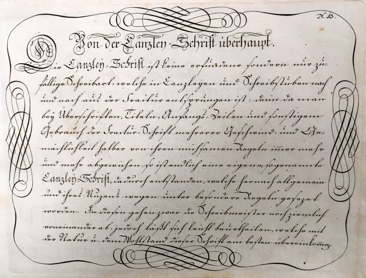 Fig. 3 Johann Michael Schirmer. “Von der Canzleÿ=Schrift überhaupt” or “Concerning Chancery Script” in Geöfnete Schreib=Schule…. Copperplate 13. Courtesy of Winterthur Museum Library Collection of Printed Books and Periodicals, Wilmington, DE, Z43 S33.