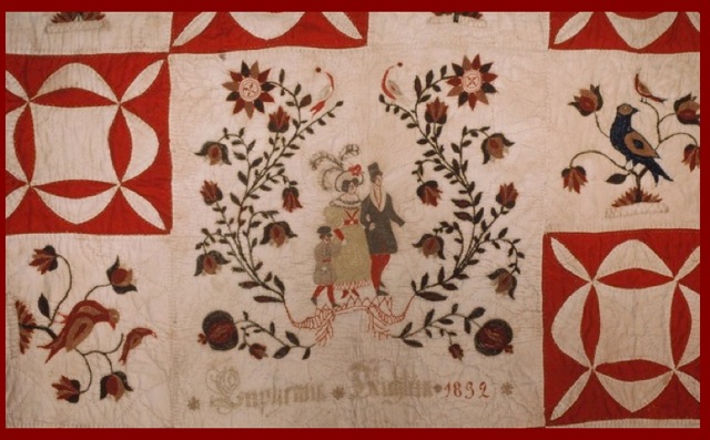 Fig. 10 FRAKTUR MOTIF WEDDING OWNER QUILT BLOCK, 1832 ATTRIBUTED TO EUPHEMIA KICHLINE (1819-1884) Courtesy of Metropolitan Museum of Art, NYC, 2016.432. Photo © and courtesy of Patricia Herr.