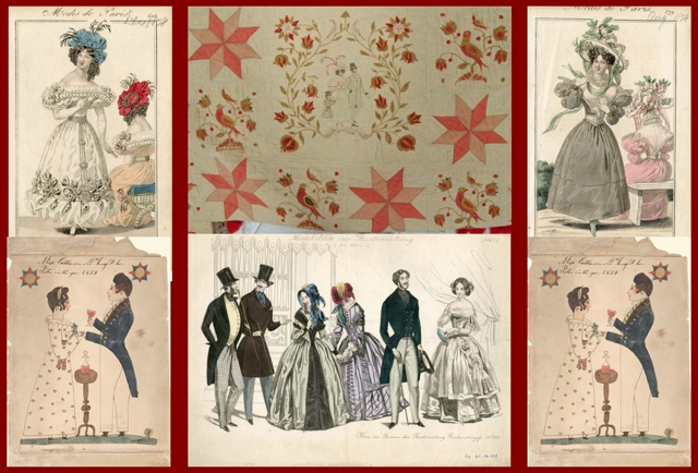 Fig. 14 STYLISH CLOTHING STYLES 1820-1840 IN CENTER QUILT BLOCK Courtesy of MMA Fashion Plates 064, 034, 046; FLP 1068.18.29; Moravian Museum of Bethlehem M849.01