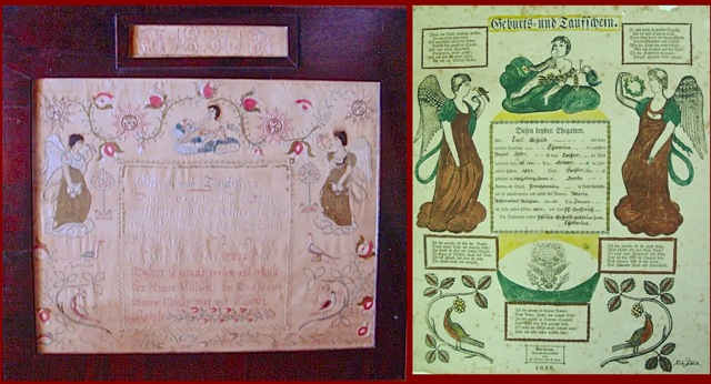 The embroiderer of Elisabeth Köbler’s Taufschein had to be someone, either a family member or a friend, who had access to Elisabeth’s birth and baptismal information possibly from St. Paul’s Lutheran “Blue Church” records or from a family member. Had there been an original birth and baptismal certificate from which to work, one suspects the motifs from Ebner’s printed Taufschein, contemporary to the time in which the needleworker was actually making the piece, would not have been substituted for original decorative elements. We don’t know if Elisabeth was still alive in 1830, but if so, as already mentioned, she would have been fifty-four years old. Johann Philip Wind is the only one for whom we have additional records attesting to some of his life activities. The needleworker who worked this embroidery could never have guessed that this token of her hands and heart would one day be one of the very few footprints left to show that Elisabeth Köbler, her family, and her baptismal sponsors ever walked this earth.